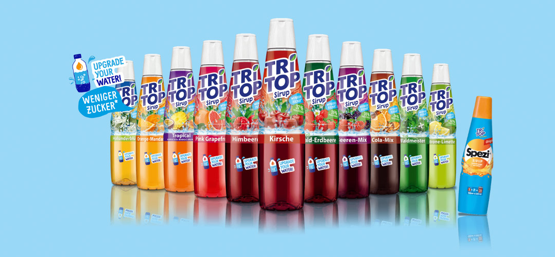 TRi TOP ist seit jeher der fruchtige Sirup-Spaß für die ganze Familie. Alles begann in den bunten 70er-Jahren, doch auch heute sorgen die fruchtigen Sirupe – einfach mit Wasser gemischt – für jede Menge gute Laune und Spaß im Glas. Dabei kann man die leckeren Fruchtsirupe ebenso zum Verfeinern von Süßspeisen verwenden oder für Cocktails und Backrezepte. Mit 14 bunten Sorten bringt TRi TOP das Sirup-Original immer Geschmack und Lebenslust in den Alltag!